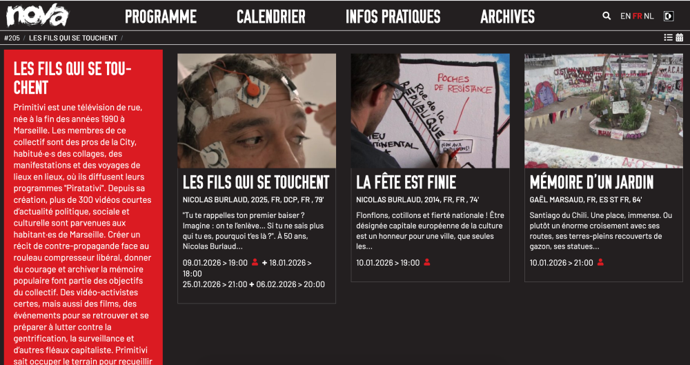 Les camarades de l’excellentissime et infatigable Cinéma Nova de Bruxelles ouvrend grand leurs portes en janvier et projettent « Les fils qui se touchent » (en présence de Nico Burlaud, co-pro Primitivi avec 529 Dragons) le 9, le 18, le 25 et le 6fév et « La fête est finie » et « Mémoires d’un Jardin » de G. Marsaud, productions Primitivi le 10 ! Faites tourner
